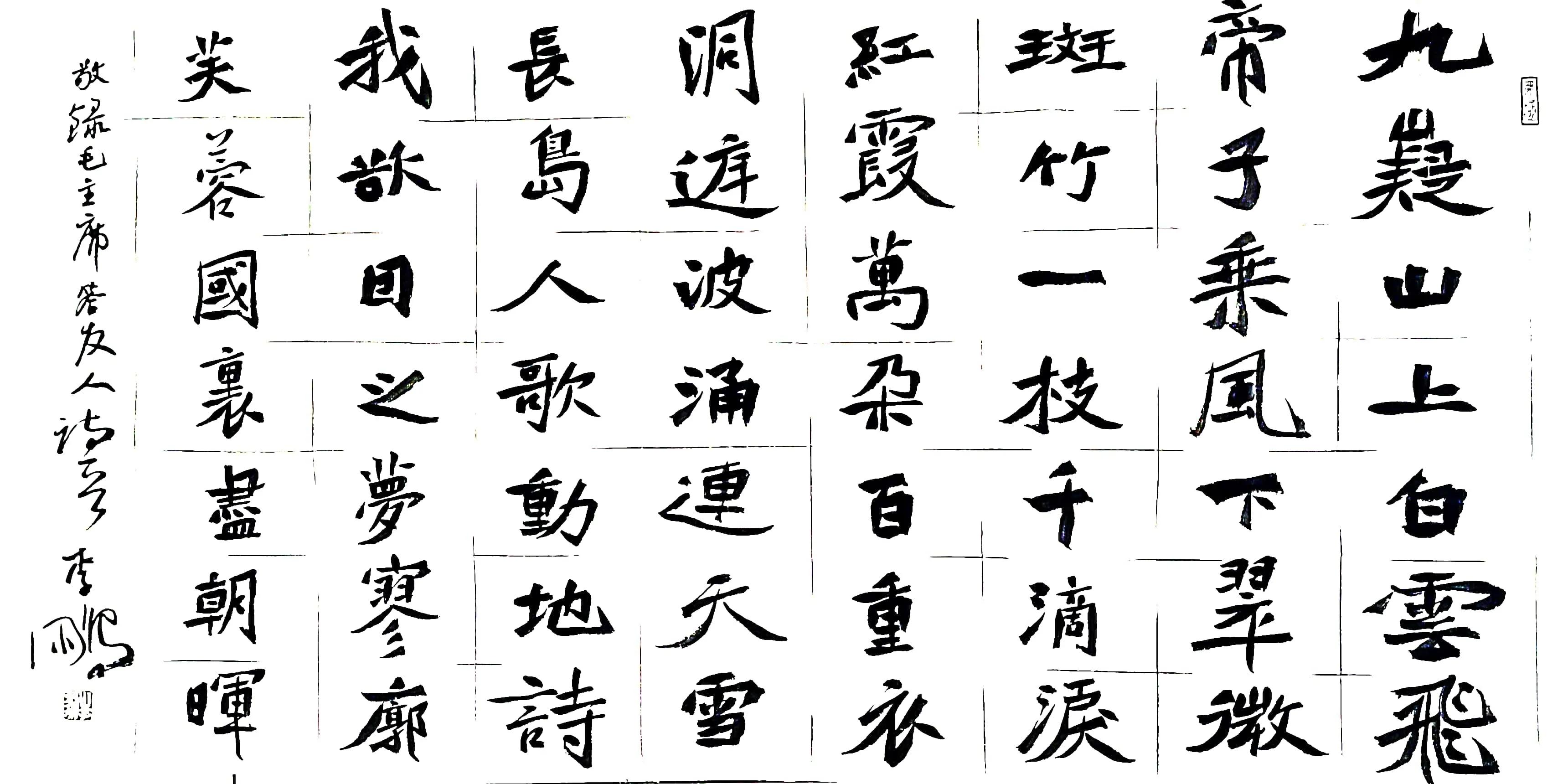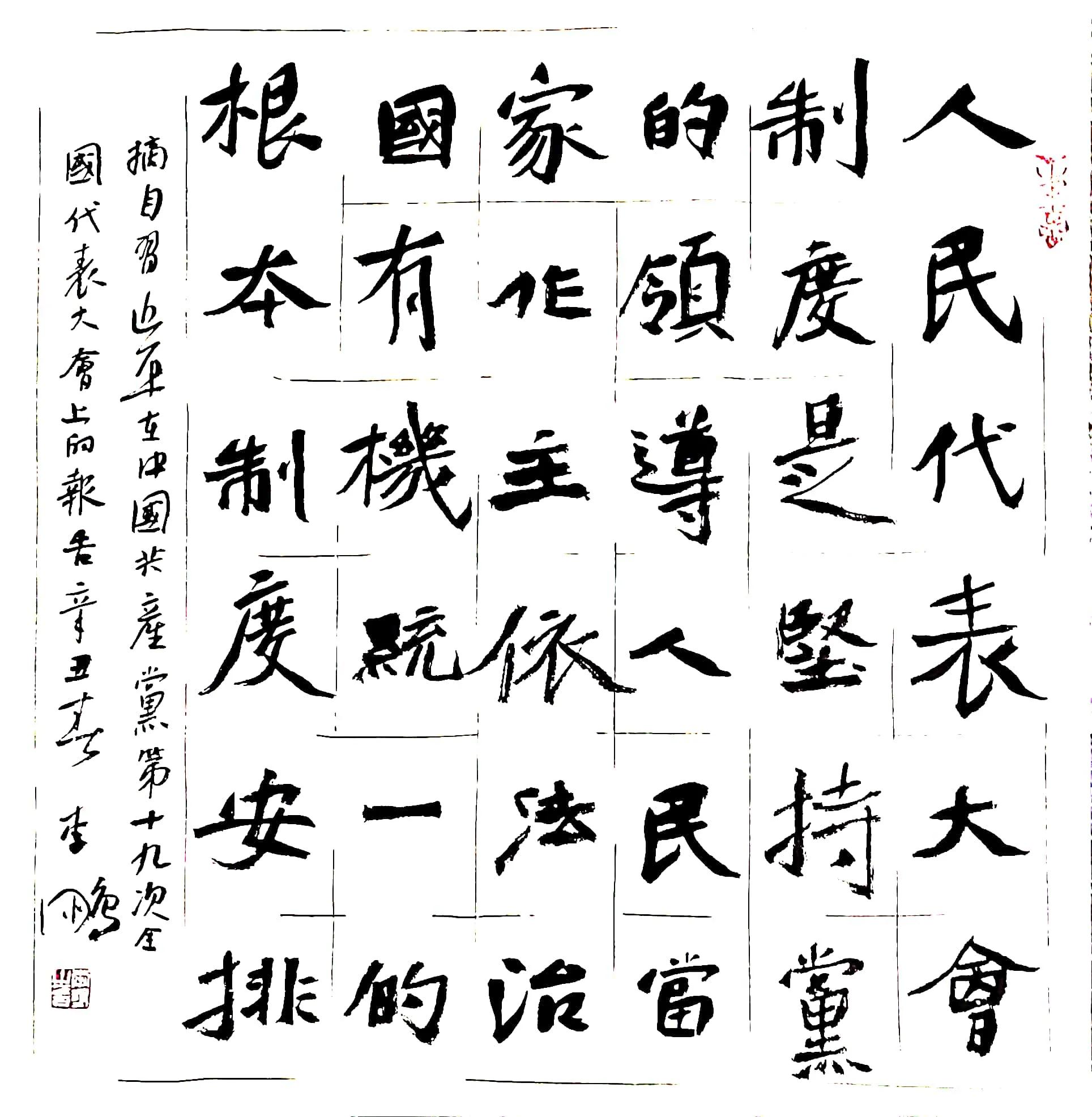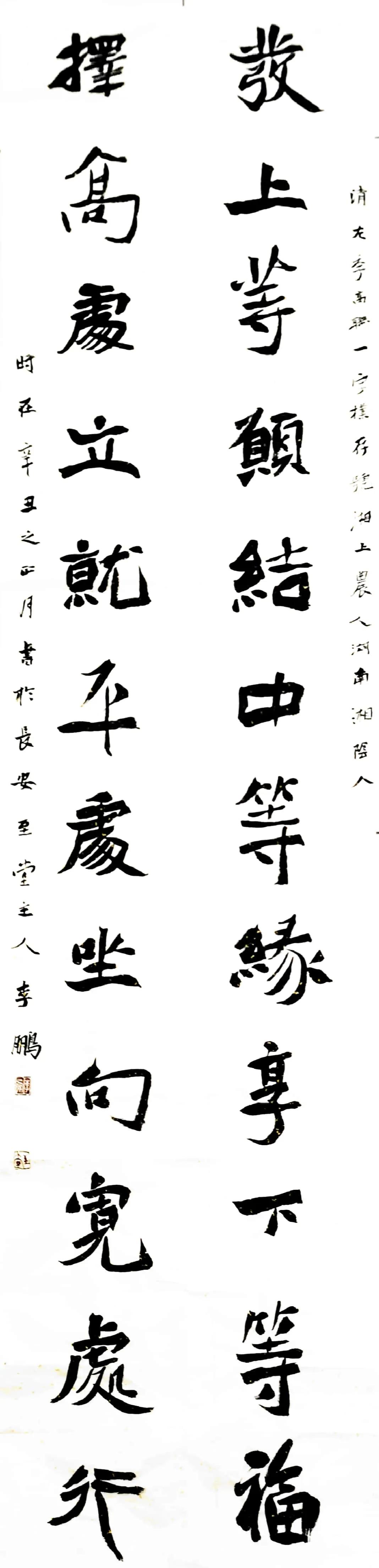 李鹏 陕西淳化人。号松静斋、至堂,现居西安,书法深得中国书法名家胡立民先生指教。现为中国楷书艺术研究院研究员,陕西省书法家协会会员,陕西青年书法家协会会员,西安毛泽东书法研究院副秘书长,西安碑林书协理事,西安市美术家协会员。主攻魏碑兼习行草,书法崇尚雄强高古、意态奇逸、兴趣酣足、气魄雄伟。